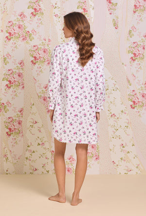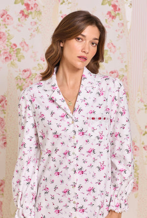 This classic 100% Cotton Flannel Nightshirt is perfect for a chilly evening. Long sleeves and a notched collar trimmed with Venise edge lace offer timeless appeal. The chest pocket is embellished with beaded embroidered Venise floral lace with a velvet ribbon. Complete with side-seam pockets for added versatility, a full button front of round Akoya buttons, and a softly ruffled shirt-tail hem.