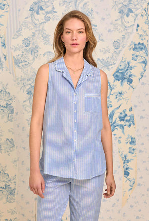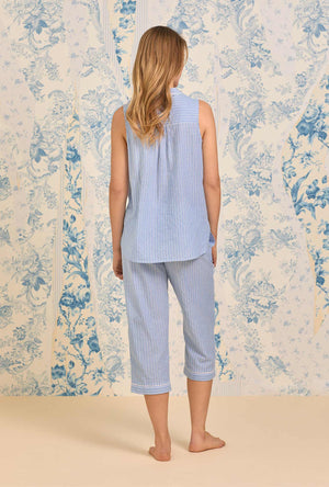 This adorable sleeveless capri PJ set is crafted in our best 100% cotton dobby stripe woven yarndye. The tunic style top features daisy chain trim at the top notch of the collar, a full button front with round akoya buttons and a chest pocket. The pants have an elasticized waist with a drawstring closure and side seam pockets.