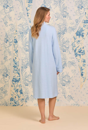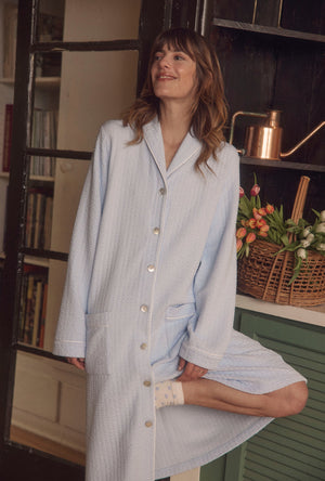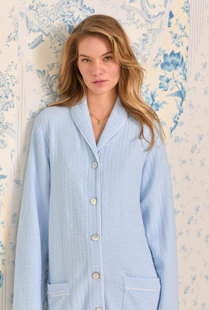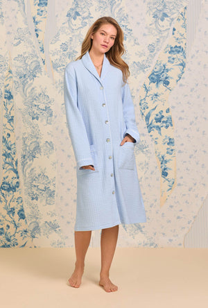 This beautiful textured silky waffle knit waltz robe features a notch collar with a full button front of akoya round buttons on the front side to look oh so pretty but are magnetic for easy opening. Finished with long sleeves with contrast satin piping details, and front patch pockets.