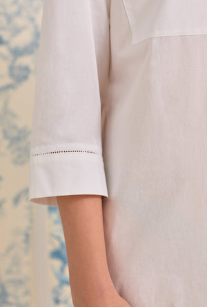 Be effortlessly chic in our woven cotton lawn long shirt dress this spring. Features a collared neckline and 3/4 length sleeves. It also includes two center front pockets at the bust, a full button front, and a straight hem with side slit details.