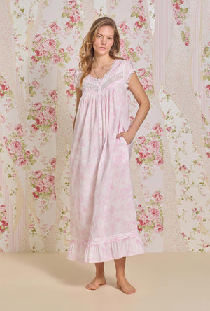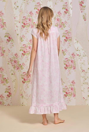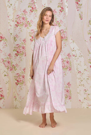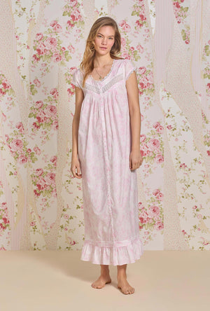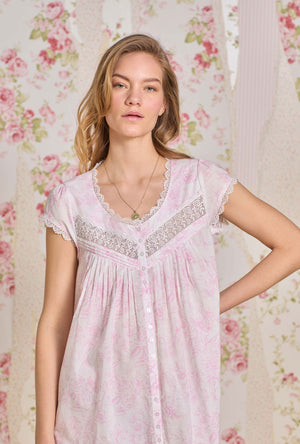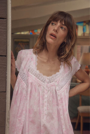 A delicate cap sleeve long button front robe crafted in 100% cotton woven lawn. Features a beautiful round neckline trimmed with gorgeous venise floral lace. The button placket is embellished with intricate venise floral lace with horizontal pintucking details. Finished with a full button front adorned with akoya shell floral buttons and a ruffled hemline.