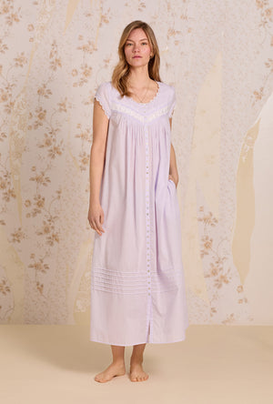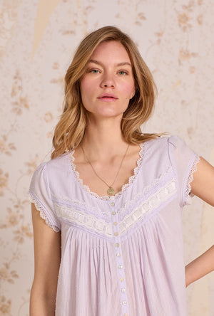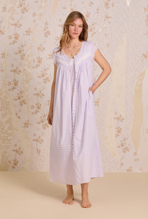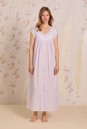 This cap sleeve button front robe is made with classic design. Crafted in our dreamy Cotton Rich Stripe Swiss Dot. Delicate edge lace trims the round neckline and cap sleeves. The yoke placket features beaded venise floral lace adorned with an embroidered satin ribbon and horizontal pintucking details. Finished with a full button front of round Akoya shell buttons.