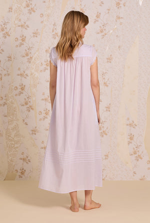 An iconic "Eileen" ballet nightgown crafted in dreamy Cotton Rich Sheer Stripe Swiss Dot. This adorable nightgown features delicate edge lace along the sweetheart neckline and beaded venise floral lace with a lovely embroidered satin ribbon at the yoke. Finished with round Akoya shell buttons at the placket and horizonal pintucking details along the hem.