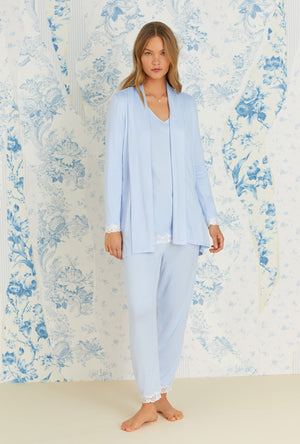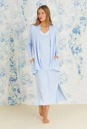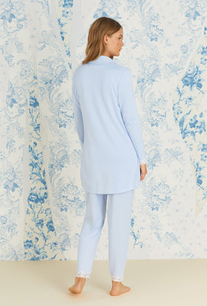 This stunning cardigan is a great piece for layering. It is designed with soft sweater knit in a soft baby blue color. Gorgeous 2" embroidered lace trims the sleeve openings. It has two side seam pockets.