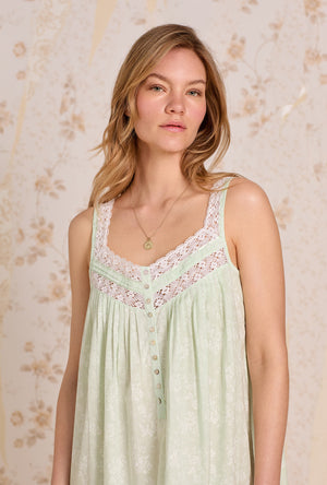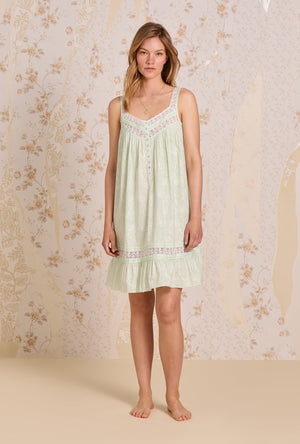 A sweet chemise crafted in our featherlight Cotton Woven Lawn. Features venise floral lace trim along the sweetheart neckline and inserted at the yoke. Other design details include vertical pintucking details and round Akoya shell buttons. Venise floral lace details above the ruffled hem.