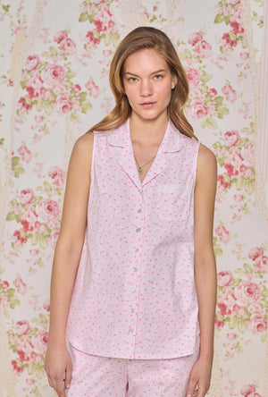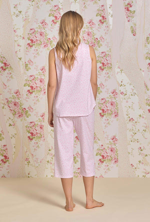 Elevate your night-time comfort with this cozy cotton jersey knit PJ set. The tunic style top features a notch collar trimmed with intricate venise floral lace that is beaded with a lovely satin ribbon. Other class design details include a front patch pocket embellished with embroidered lace and akoya round buttons down the front. The capri pants have an elasticized waist with a drawstring closure.