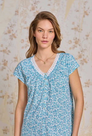 This thoughtfully designed cap sleeve nightshirt features delicate venise floral edge lace that trims the v-neckline with pintucking details. Other class details include a placket of akoya round buttons and a lovely shirt tail hem. Crafted in our best 100% Cotton Jersey Knit