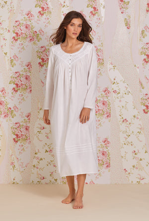 Poetry in motion: this flowy cotton gown offers up lightweight comfort without skimping on romance. The neckline is an exquisite combination of pintucks and daisy-chain lace. Finished with a placket of luminous akoya shell buttons.