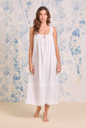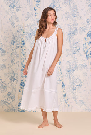 Woven from airy 100% cotton lawn, this modern gown is soft to the touch and gently structured for an easy, graceful drape. A rounded neckline is trimmed with daisy-patterned Venise lace, beaded with satin ribbon and edged in a delicate baby ruffle that continues front to back. Soft shirring along the yoke adds gentle volume, while a keyhole opening with a self-tie bow at the center front lends a sweet, feminine touch. Finished with rows of pintucks above the hem and a fluttery baby ruffle, this piece captures the lightness of spring and the timeless joy of softness.