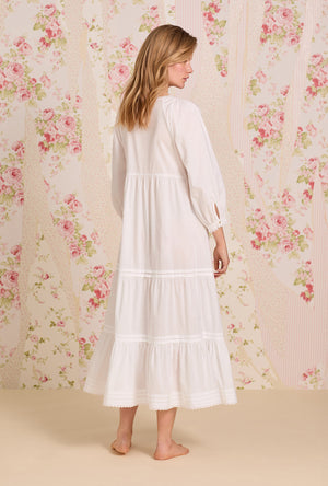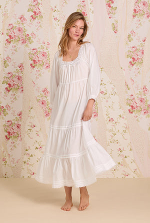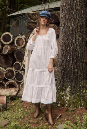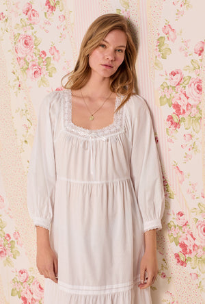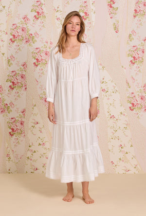 This dreamy 3/4 sleeve tiered nightgown is crafted in our classic 100% cotton woven lawn. Features a square neckline trimmed with venise floral lace that is is beaded with a satin ribbon followed by vertical pintucking. Features horizontal pintucking throughout the skirt tiers and a ruffled hem.