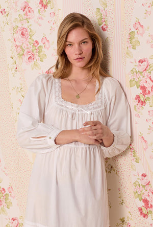This long sleeve short nightgown is crafted in the most comfortable cotton jersey knit. This nightgown features a classic sweetheart neckline adorned with edge lace. It has inserted venise floral lace and intricate pintucking details at the yoke. Finished with flower-shaped buttons and a ruffled hem.