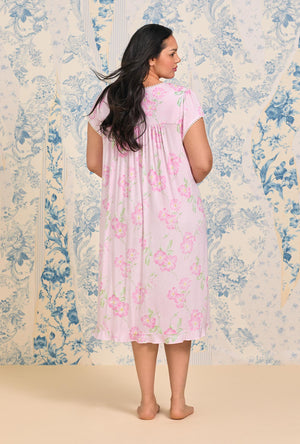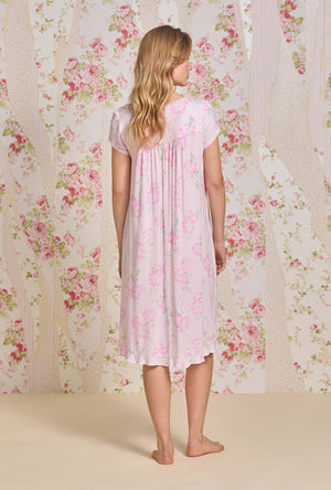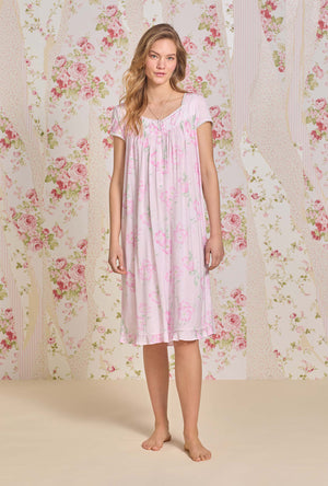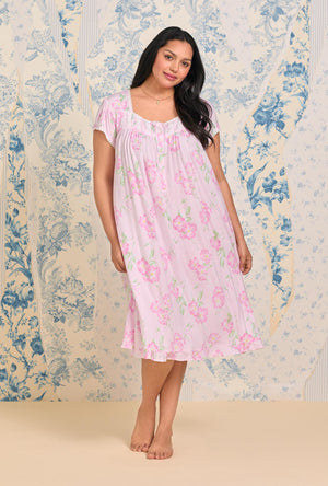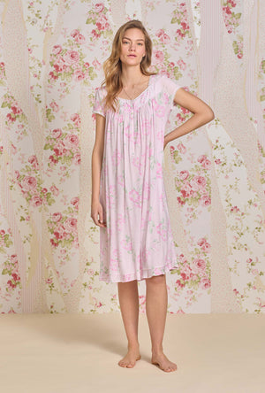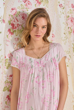 An ethereal cap sleeve waltz nightgown in our soft modal knit jersey. … the sweetheart neckline is trimmed with delicate venise floral lace. Vertical pintucking details embellished with venise floral lace and a satin ribbon bow at the yoke. Finished with akoya floral buttons and a baby ruffle hem.